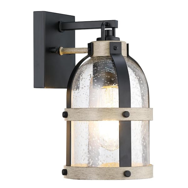 10.5 in. 1-Light Black and Wood Outdoor Hardwired Wall Lantern Sconce with No Bulbs Included