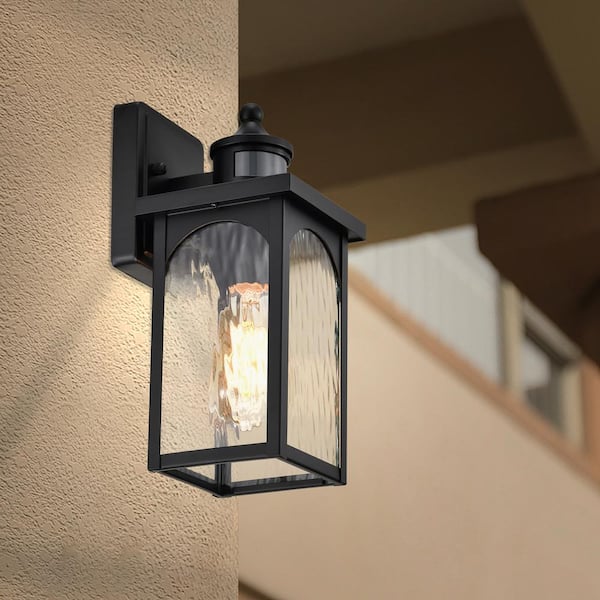 12 in. 1-Light Black Motion Sensing Dusk to Dawn Outdoor Hardwired Wall Lantern Sconce w/ Water Wave Clear Glass 2-Pack