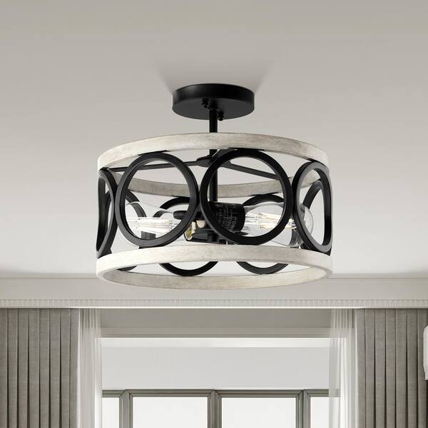 13 in. 2-Light Black and White Wood Finish Round Contemporary Semi- Flush Mount for Dining Room Hallway Entryway