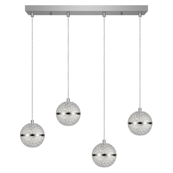 20-Watt 4-Light Chrome Finish LED Linear Island Pendant Light with Crystal Orb Shade