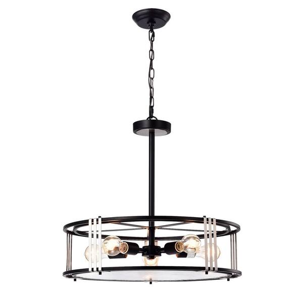 5-Light Black and Brushed Nickel Pendant Light Modern Drum Chandelier with Verre Strie Glass