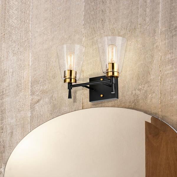 Briarwood 13 in. 2-Lights Black and Antique Brass Vanity Light with Clear Cone Glass Shades