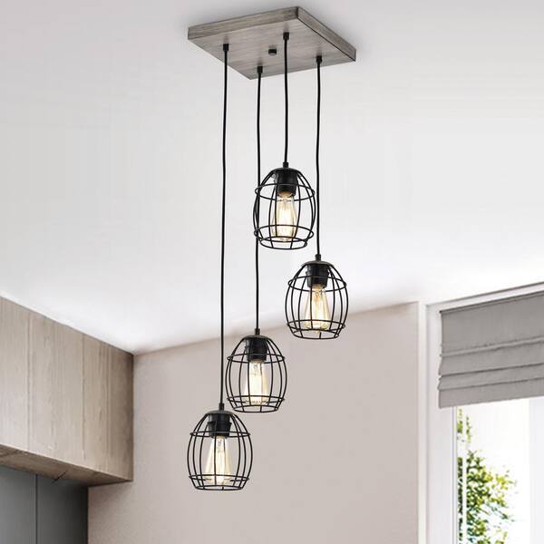 Triscot 4-Light Modern Farmhouse Gray Wood Cluster Pendant with Black Cage