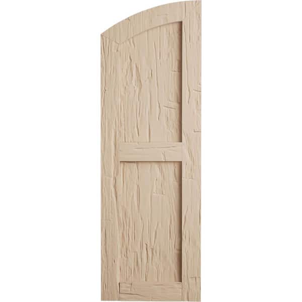 12 in x 36 in Polyurethane Hand Hewn Two Equal Flat Panel Elliptical Top Faux Wood Shutters Primed Tan