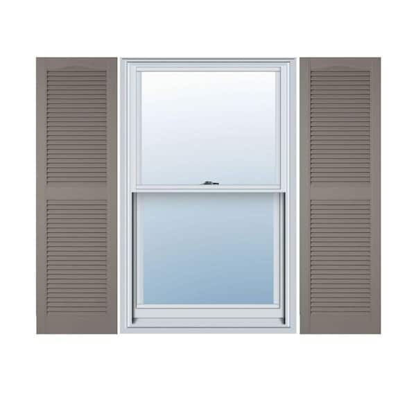 12 in. x 64 in. Lifetime Vinyl Custom Cathedral Top Center Mullion Open Louvered Shutters Pair Clay