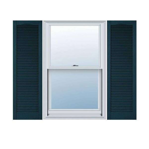 14-1/2 in. x 29 in. Lifetime Vinyl Custom Cathedral Top All Louvered Open Louvered Shutters Pair Midnight Blue