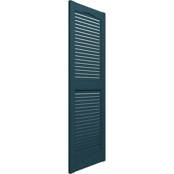 14-1/2 in. x 29 in. Lifetime Vinyl Custom Cathedral Top Center Mullion Open Louvered Shutters Pair Midnight Blue