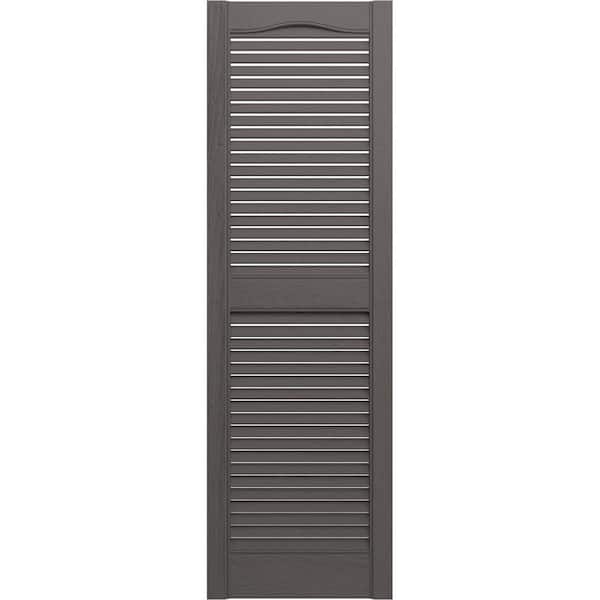 14-1/2 in. x 67 in. Lifetime Vinyl Standard Cathedral Top Center Mullion Open Louvered Shutters Pair Tuxedo Grey