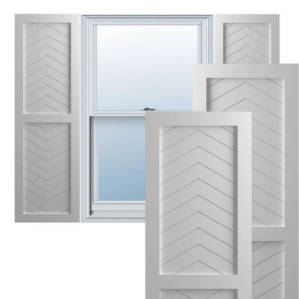 15 in. x 77 in. Flat Panel True Fit PVC Two Panel Chevron Modern Style Fixed Mount Shutters Pair in Primed