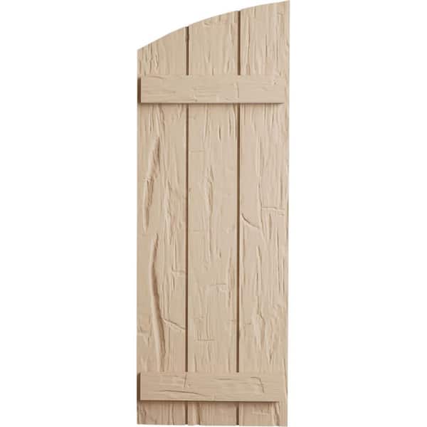 16.5 in x 38 in Polyurethane Hand Hewn Three Board Joined Board-n-Batten Elliptical Top Faux Wood Shutters Primed Tan