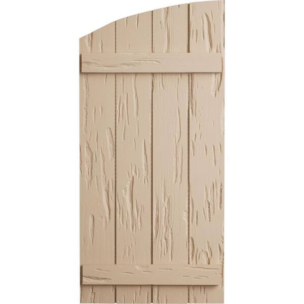 22 in x 64 in Polyurethane Pecky Cypress Four Board Joined Board-n-Batten Elliptical Top Faux Wood Shutters Primed Tan