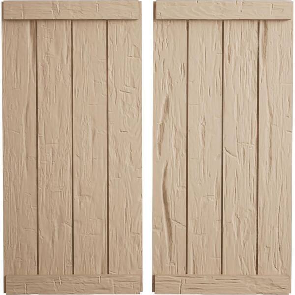 22 in. x 66 in. Timberthane Polyurethane 4-Board Joined Board-n-Batten Hand Hewn Faux Wood Shutters, End Batten Pair