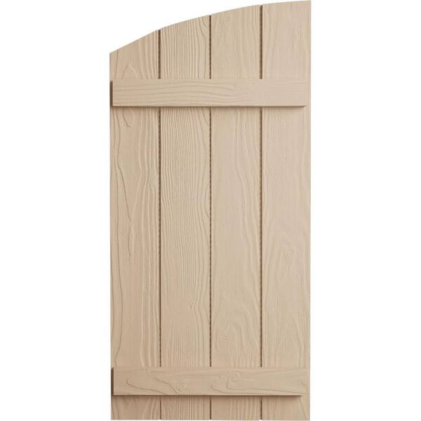 22 in. x 68 in. Polyurethane Sandblasted 4-Board Joined Board and Batten Elliptical Top Faux Wood Shutters Primed Tan