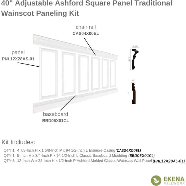 94 1/2 in. (Adjustable 40 in. to 44 in.) 26 sq. ft. Polyurethane Ashford Square Panel Wainscot Kit Primed