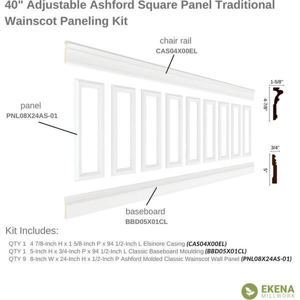 94 1/2 in. (Adjustable 40 in. to 44 in.) 26 sq. ft. Polyurethane Ashford Square Panel Wainscot Kit Primed
