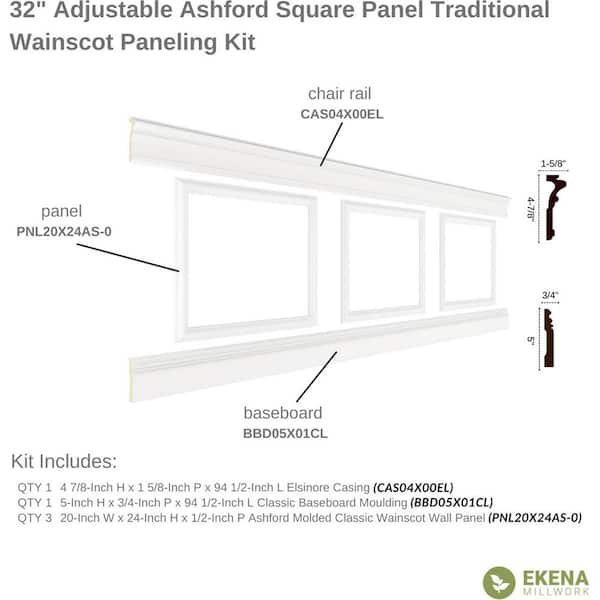 94-1/2 in. L Adjustable 32 in. H to 36 in. H Ashford Square Panel Traditional Wainscot Paneling Kit