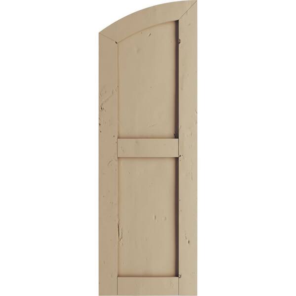 Faux Wood 15 in. x 70 in. Timberthane 2 Equal Flat Panel Elliptical Top Polyurethane Shutters Primed Tan in Knotty Pine