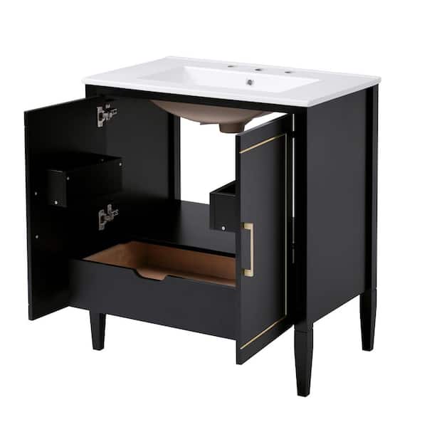 30 in. Single Sink Classic Black with Gold Detailing Bath Vanity with White Ceramic Top, Built-in Hidden Drawer