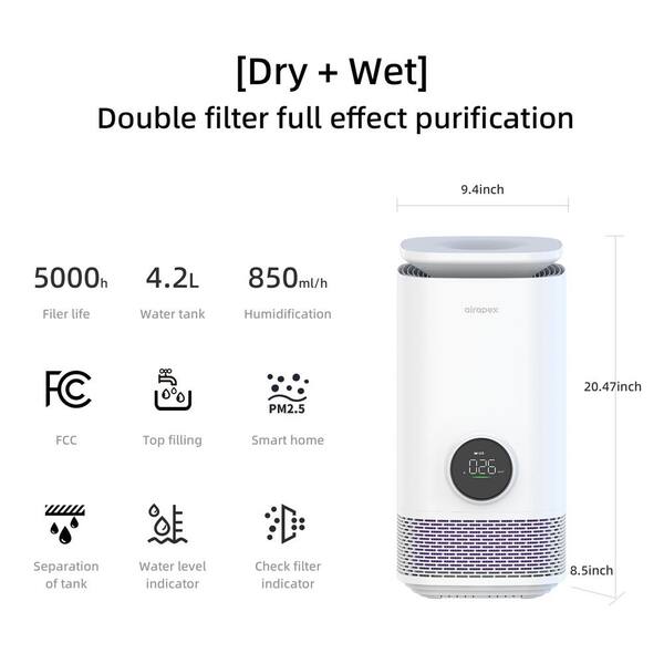 500 sq. ft. 9.9 in. W/D H13 True HEPA Personal Tabletop Air Purifier in Whites with Humidifier, Air Cleaner for PM2.5