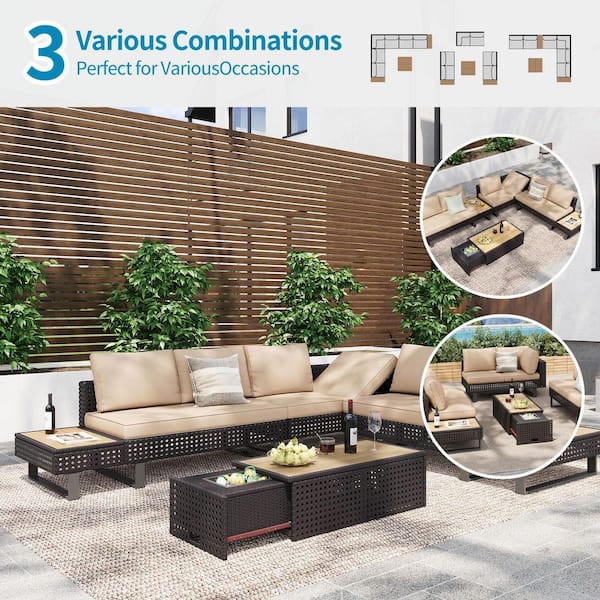 6-Person Patio Wicker Seating Set With Cushions And Pillows WithExpandable lce Bucket Coffee Table And Side Table