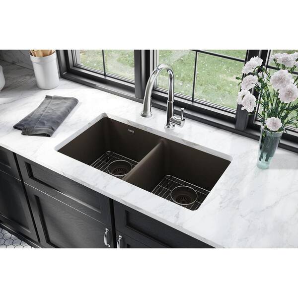 Quartz Classic Mocha Quartz 33 in. Equal Double Bowl Undermount Kitchen Sink with Faucet, Bottom Grid and Drain