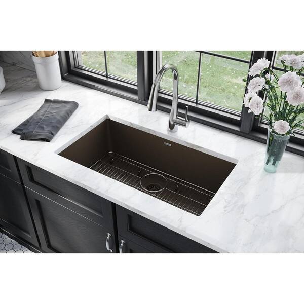 Quartz Classic Mocha Quartz 33 in. Single Bowl Undermount Kitchen Sink with Bottom Grid and Drain
