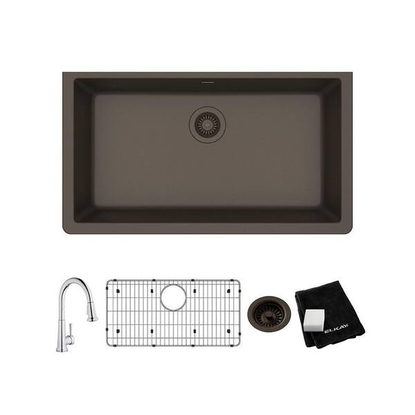 Quartz Classic Mocha Quartz 33 in. Single Bowl Undermount Kitchen Sink with Faucet, Bottom Grid and Drain