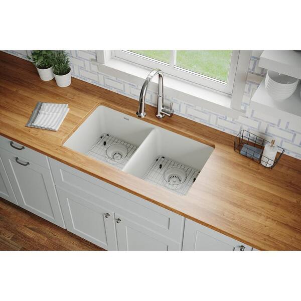 Quartz Classic White Quartz 33 in. Equal Double Bowl Undermount Kitchen Sink with Faucet, Bottom Grid and Drain