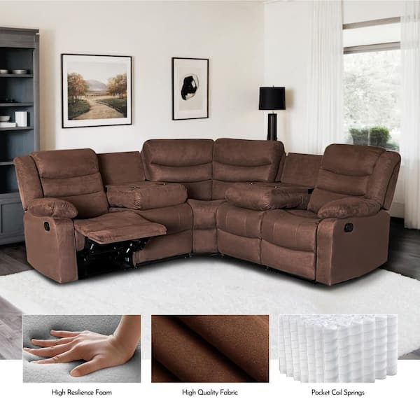 Luna 93 in. in 5 Seater Fabric Manual Recliner Sectional Sofa with Drop-Down Table and Cup Holders in Brown