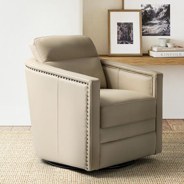 Elvira 28.74 in. Wide Beige Genuine Leather Swivel Chair with Squared Arms