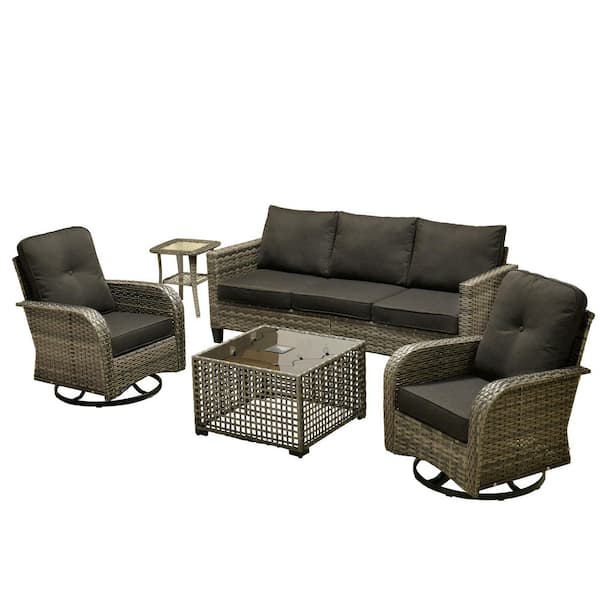 Elvira Gray 5-Piece Wicker Patio Conversation Seating Sofa Set with Black and Swivel Rocking Chairs