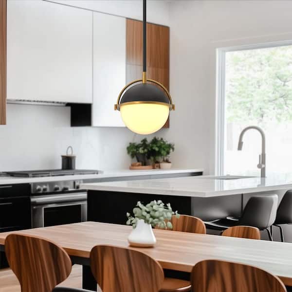 1-Light Black and Gold Mini Pendant Light with Globe Milky Glass Shade E26 Socket No Light Bulb Included