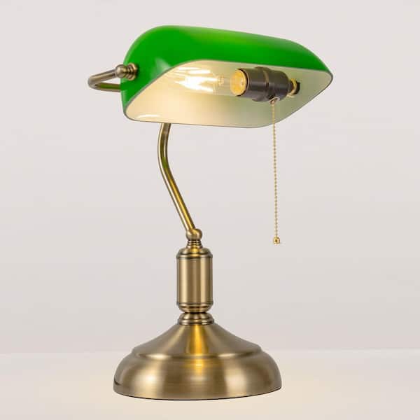 15 in. 1-Light Rustic Brass Table Lamp with Green Glass Shade E26, Modern Table Lighting for Bedroom or Living Room