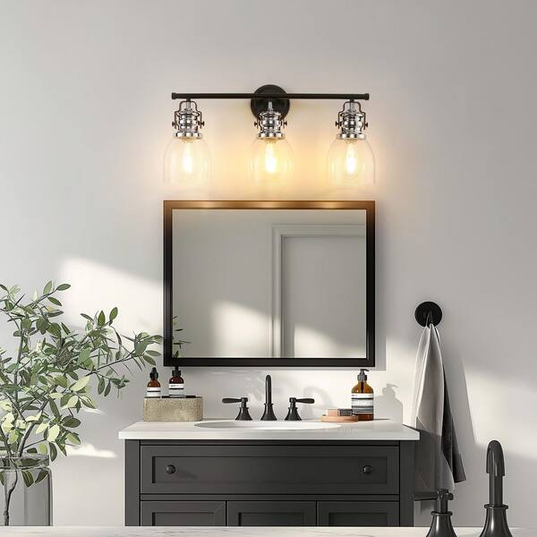 24 in. 3-Light Black and Nickel Vanity Light with Clear Glass Bell Shades for Bathroom and Powder Room or Dressing Room