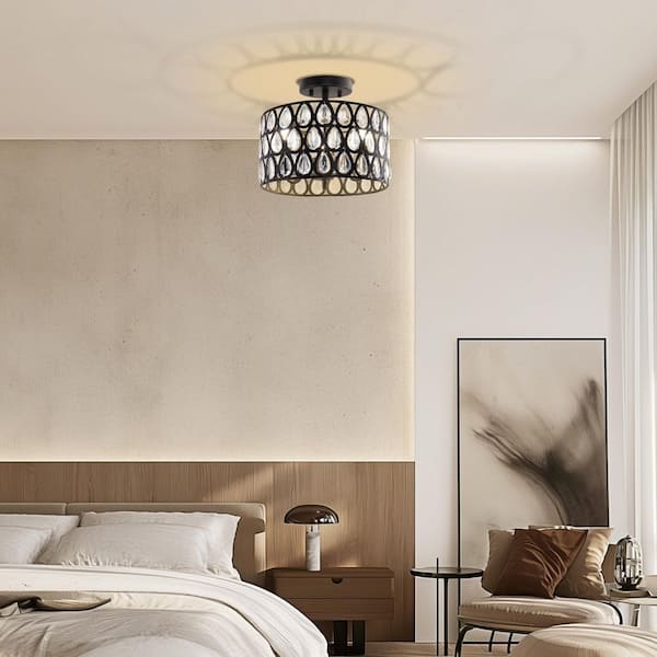 3-Light Matte Black Semi-Flush Mount Ceiling Light with Teardrop Crystal Accents, E12 Base