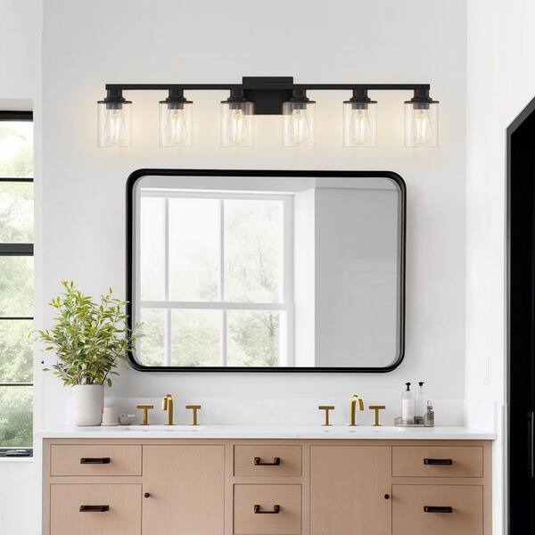 40 in. 6-Light Black Metal Dimmable Vanity Light with Clear Cylinder Glass Shades for Vanity Powder Room Dressing Room