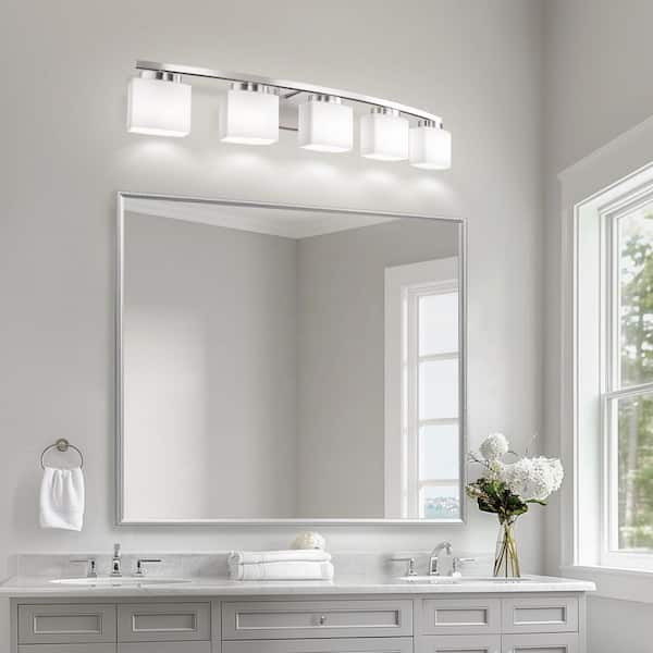 41 in. 5-Light Nickel Vanity Light for Vanity Powder Room Dressing Room with Curved Arms and Milk White Shade