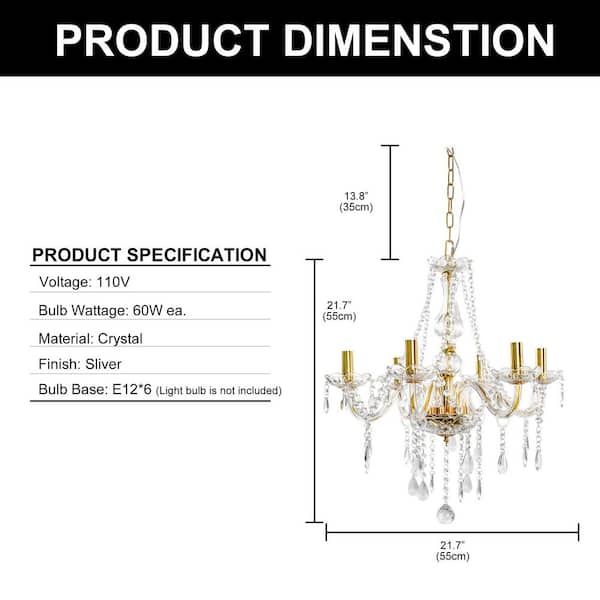 6-Light Gold Chandelier with Crystal Shade, E12 Base for Living Room, Dining Room, Entryway(Light Bulbs Not Included)