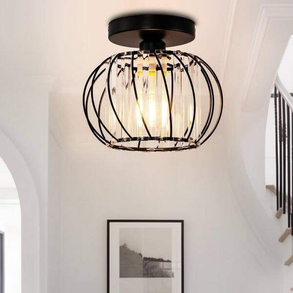 7 in. Modern Black Semi-Flush Mount 1-Light with Crystal Cage Shade for Hallway