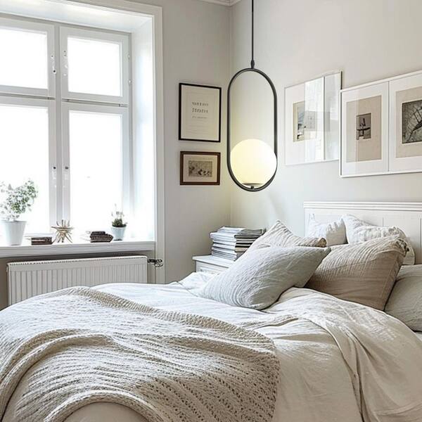 74.8 in. 1-Light Modern Black Pendant Light with Circular Ring Design and White Global Glass Shade E12 No Bulb Included