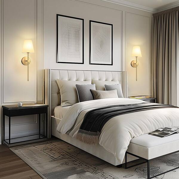 8 in. 1-Light gold Wall Sconce Lamp, Indoor Rechargeable with White Fabric Shade Suitable for Living Room (2-Pack)