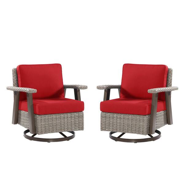 Grey Swivel Patio Wicker Chair Outdoor Rocking Chair Set with Red Thick Cushions for Porch, Balcony, Deck(2-Pack)
