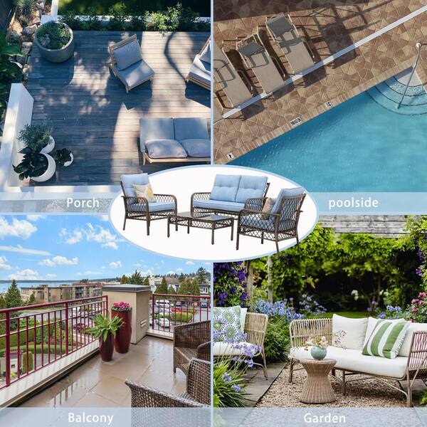 Ergonomic 4-Piece Wicker Patio Conversation Set with Blue Cushions and High Quality Pillows