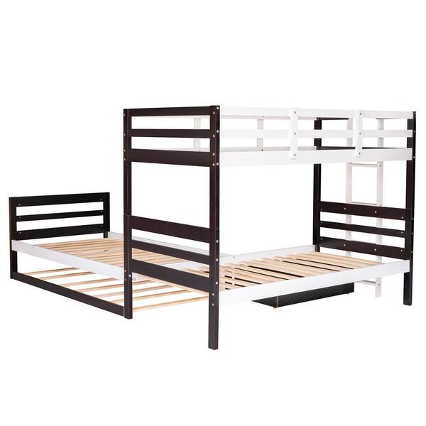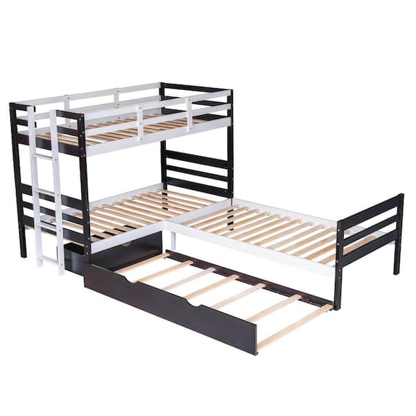 Espresso Brown Twin Size L-Shaped Bunk Bed and Platform Bed with Trundle and Drawer