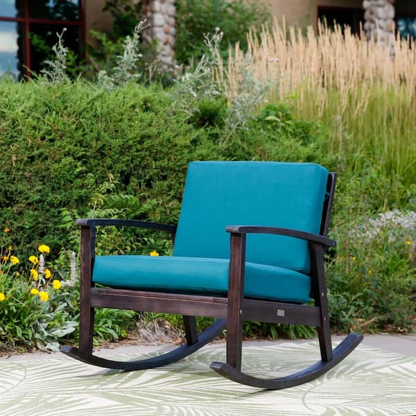 Espresso Finish Eucalyptus Wood Outdoor Rocking Chair with Dark Green Cushion for Garden, Patio, Poolside, Backyard