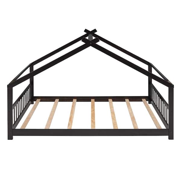 Espresso Full Size Toddlers House Bed with Headboard and Footbard, Wood House Shape Floor Kids Capony Bed Frame