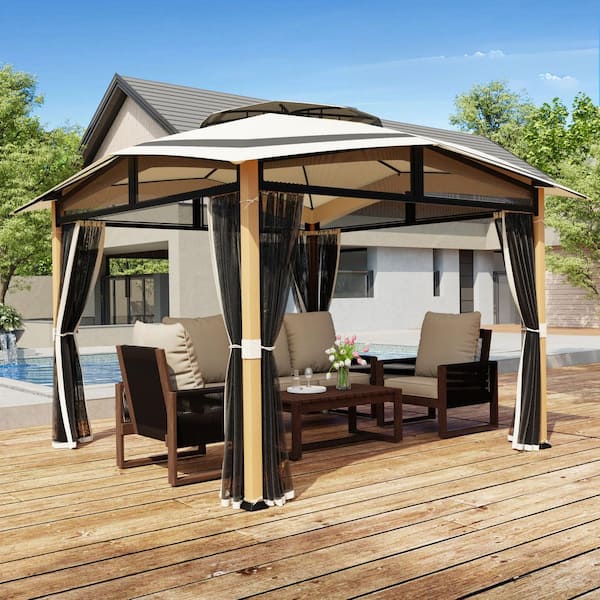11 ft. x 11 ft. Beige Outdoor Patio Steel Frame Soft Top 2-tier Gazebo with Mosquito Netting and Canopy Top