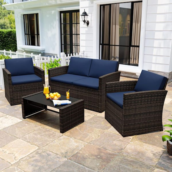4-Piece Outdoor Wicker Patio Conversation Set Furniture Set Chat Set with Dark Blue Cushions
