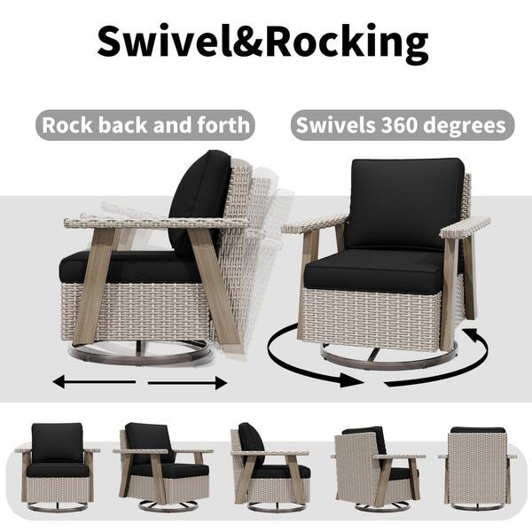 Beige Wicker Frame Outdoor Rocking Chair Patio Swivel Chair Lounge Chair with Black Cushions and 1 Side Table