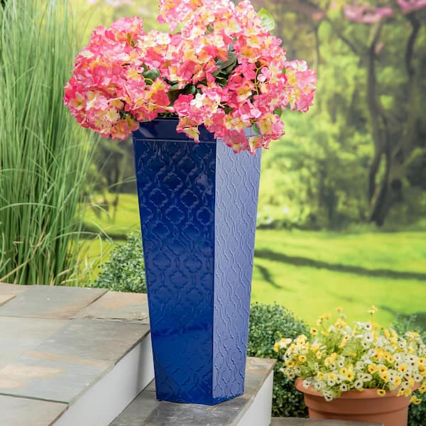 26 in. Blue Patterned Embossed Metal Front Door Planter